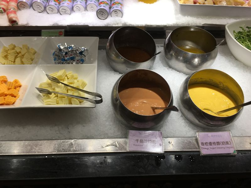 有四種生菜沙拉醬:千島醬、香橙優格、義式油醋醬、日式和風醬