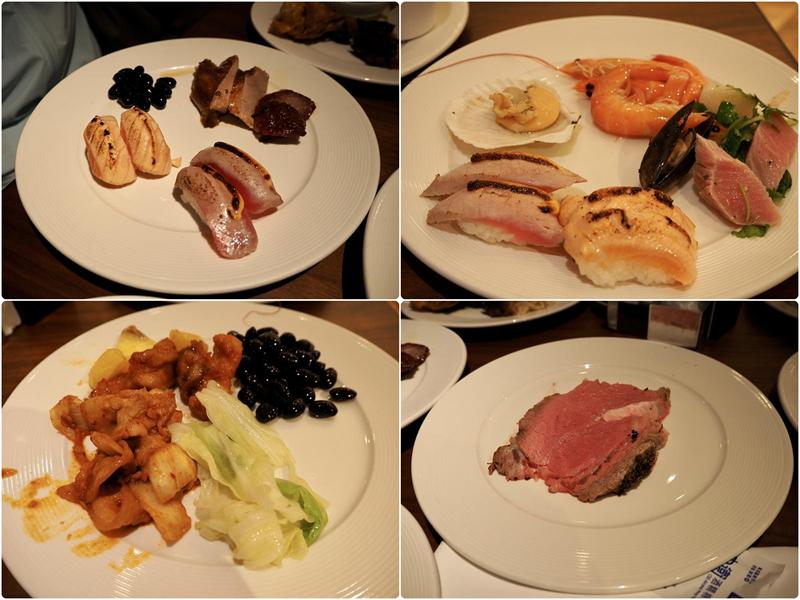 現切的牛排沾上海鹽吃的到肉質的鮮甜,熟白蝦滿鮮甜的、淡菜加上五味醬就是對味、烤鴨肉質軟嫩相當好吃,炙燒的生魚飯也很美味