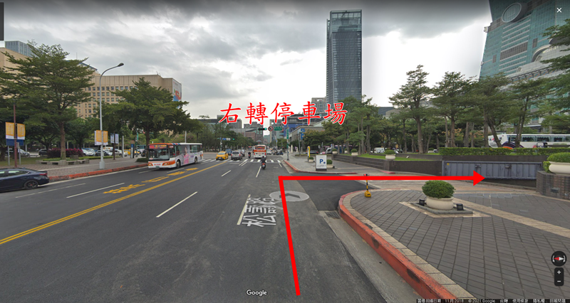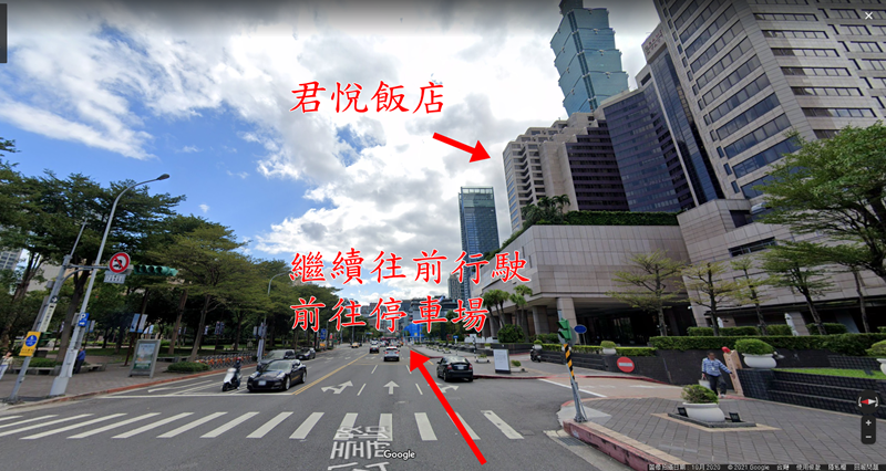 來到松壽路後看到右手邊高聳的台北101下方這一棟建築物就是台北君悅飯店,在繼續往前行駛前往飯店停車場
