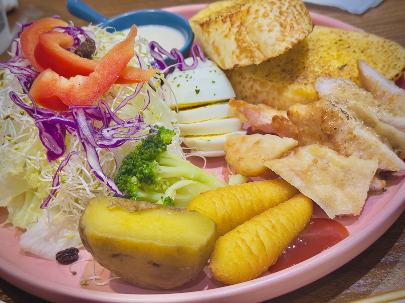 再加上營養滿分的配餐、水煮嫩蛋、新鮮的生菜沙拉以及香脆的松果薯,整體均衡又健康