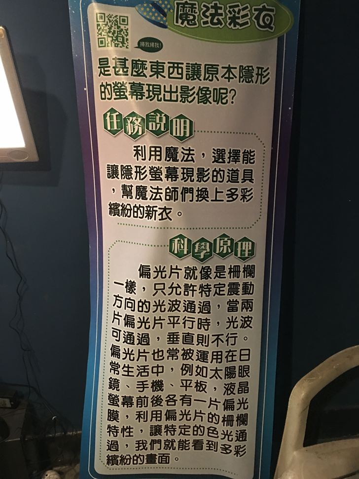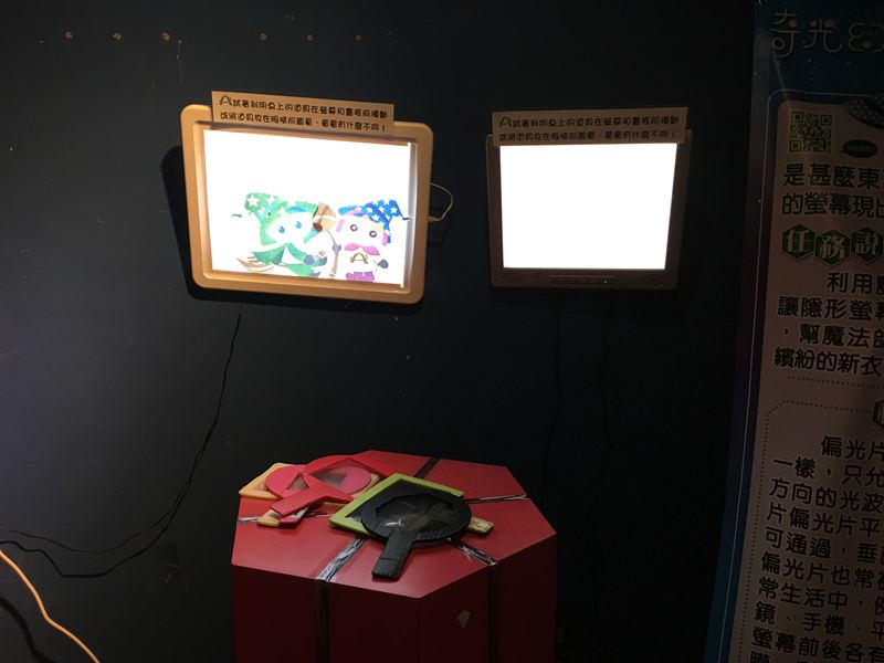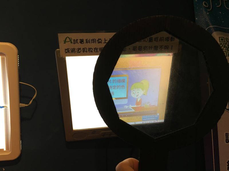 把桌上的偏光片拿到螢幕前面就可以看到畫面