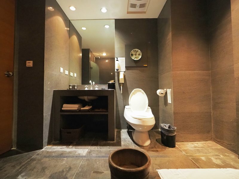 用大理石打造的衛浴空間可以感覺到沉穩的高尚感,雖然有些溫泉痕跡的水漬,不過這也證明了真的是使用硫磺溫泉水才會有這樣的水漬