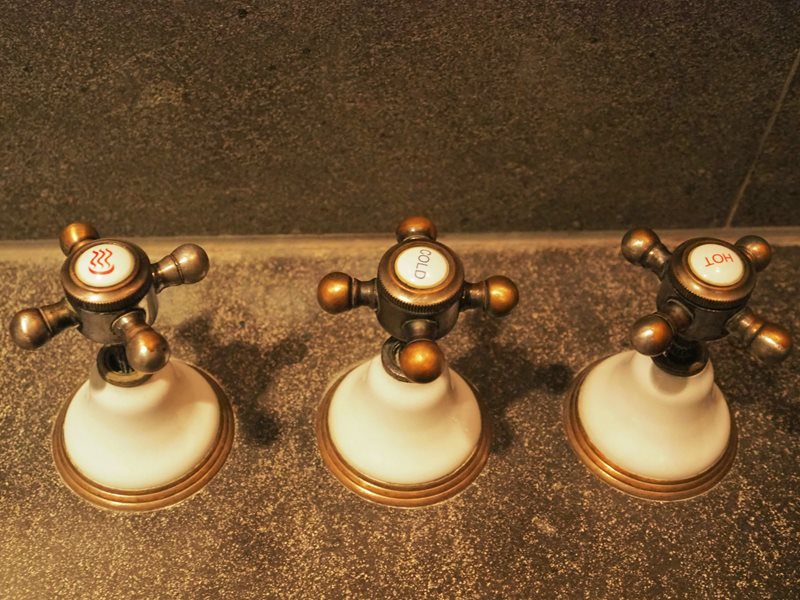↑ 水龍頭有(左)溫泉、(中)冷水、(右)熱水三種