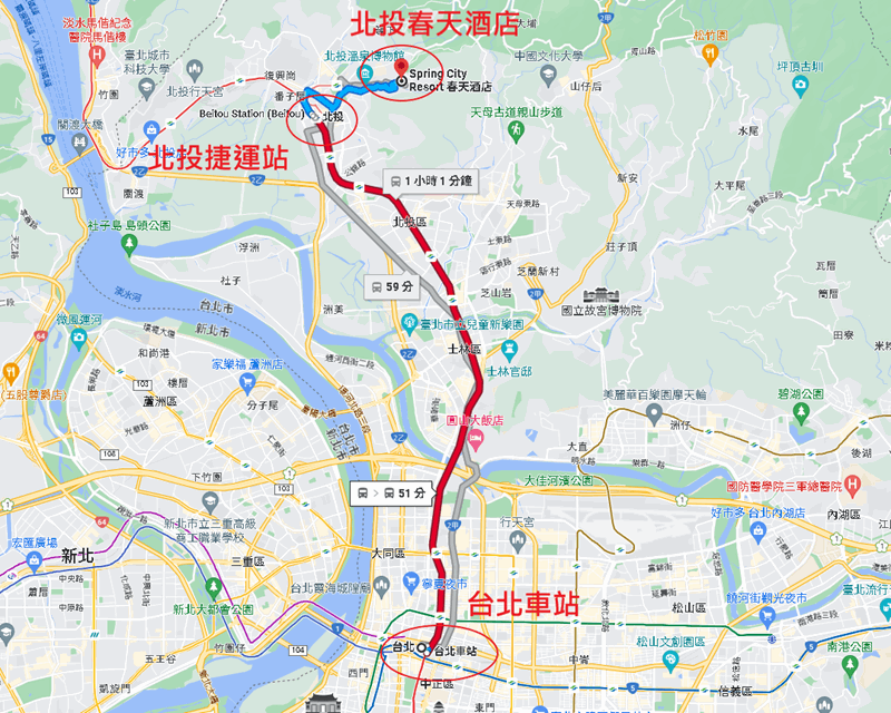 搭乘台鐵或高鐵:至台北車站下 → 轉搭台北捷運(紅線往淡水方向) → 至北投站下 → 轉搭北投春天酒店接駁車即可抵達