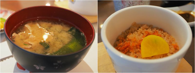 鯖魚考到表皮為焦魚肉軟嫩,淋上檸檬汁風味更佳,鮭魚鬆蒸飯表現平平,味增湯加上豬肉帶有一些肉香的鮮甜