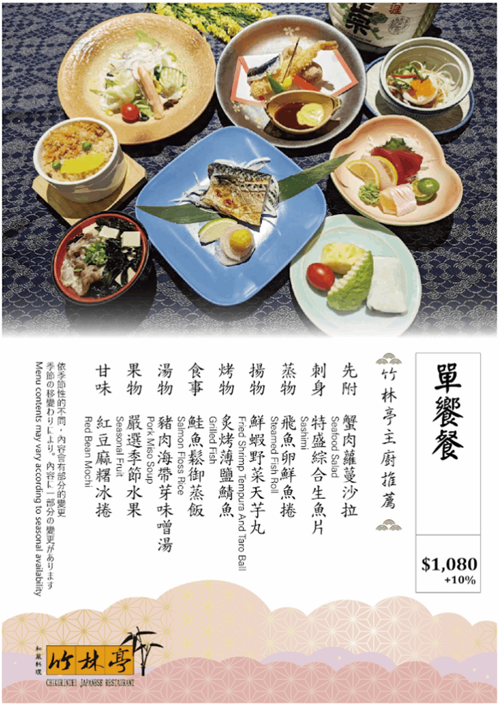 竹林亭主打日式懷石套餐料理,提供:主打套餐、浜_套餐、春天套餐、以及多人合菜,價格菜單方面可以參考官網資訊