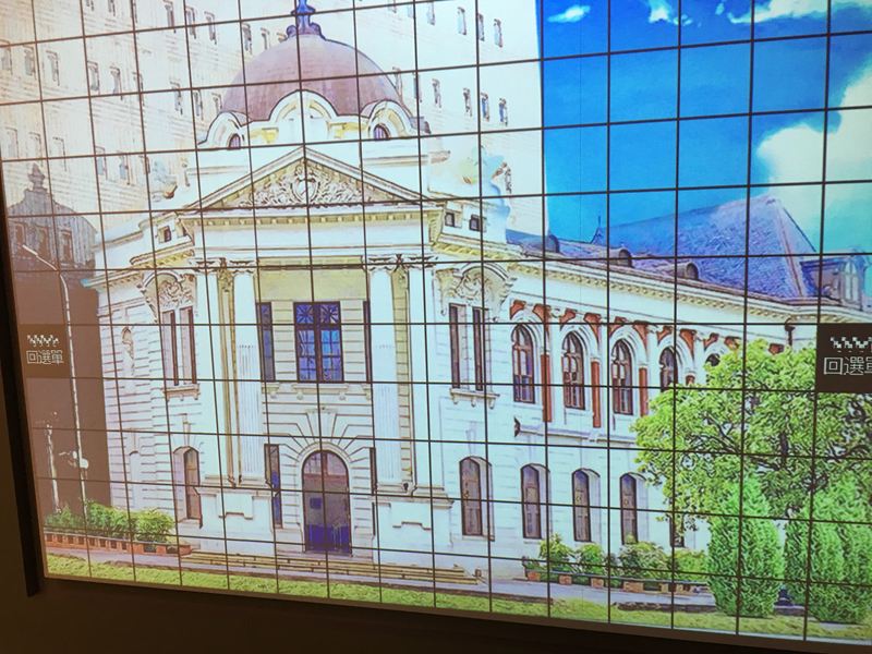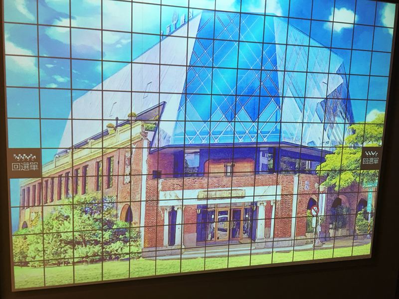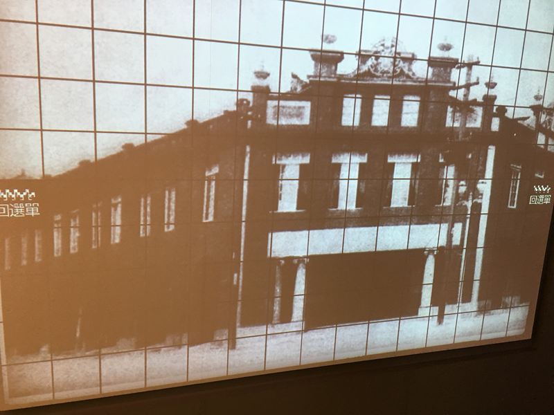 這面牆很有趣,先在選單選一個台中的景點建築物,然後用手在牆上滑動所選的建築物方塊格,畫面建築物會從以前早期的樣子變成近代改建後的全新模樣,這張圖是合作金庫,我原本以為是第四信用合作社(日出集團經營的古蹟景點),當天找了一下好像沒有第四信用合作社