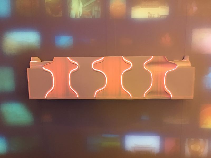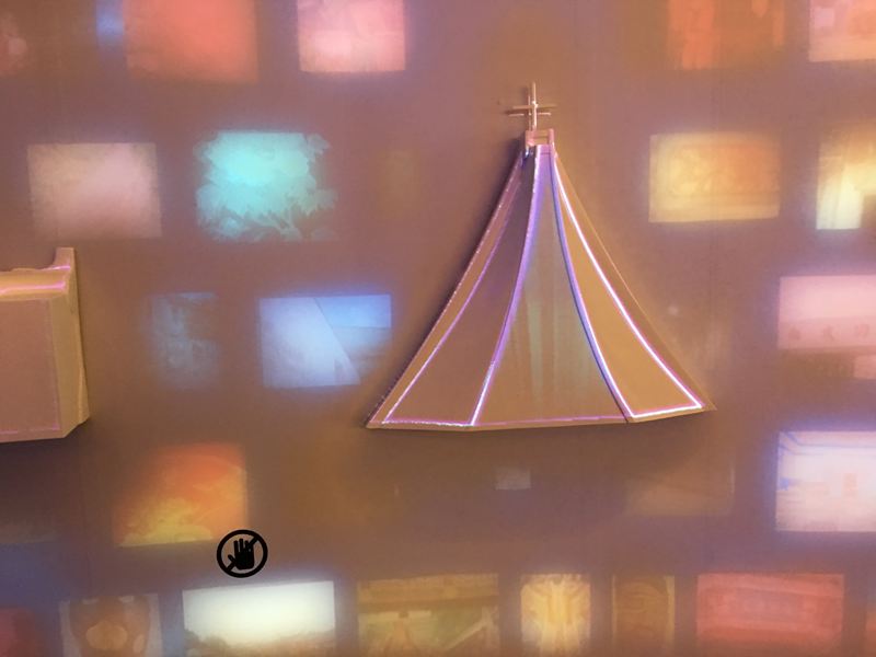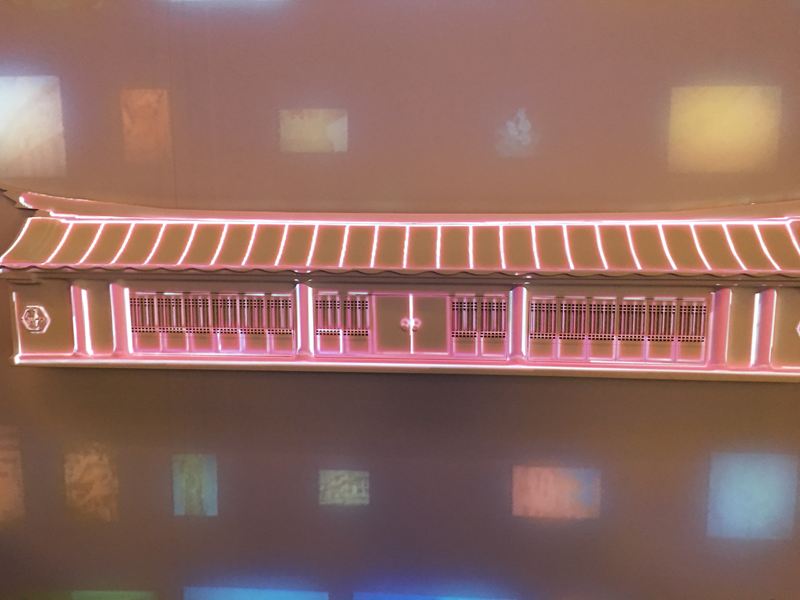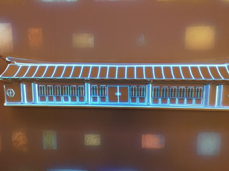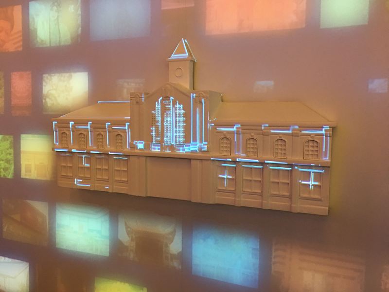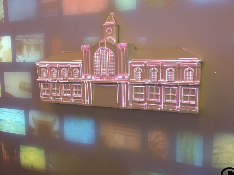 這面牆介紹著台中從古到今具代表性的四個建築物,上面投影著人文歷史的圖片由右至左的移動,也代表著四個建築物在台中完成的年代順序