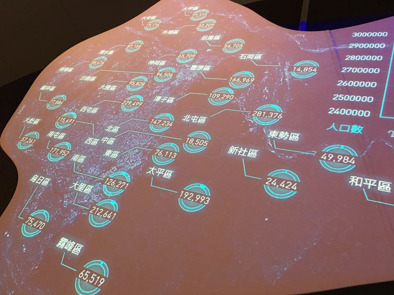 接下來這個台中AR區域地圖有著很多資訊可以看,農作物,區域人口,建築物等等很多的資訊這裡都可以查的到,據導覽人員說:上面的資料都是即時連線更新的,所以點選都可以看到最新的資料顯示