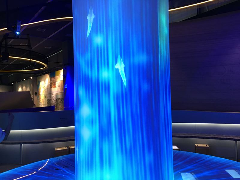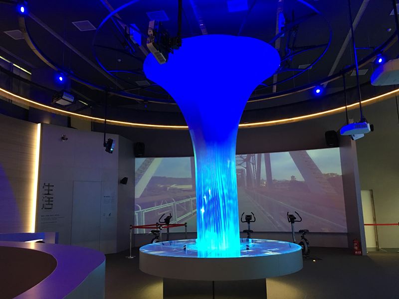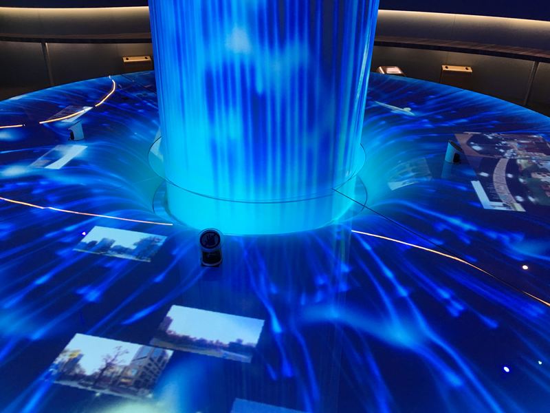 在願景館內參觀一定會被這個巨大的藍色光柱給吸引,很有科技感的設計是以,台中母親之河大甲溪的源頭:七家灣為概念去設計的