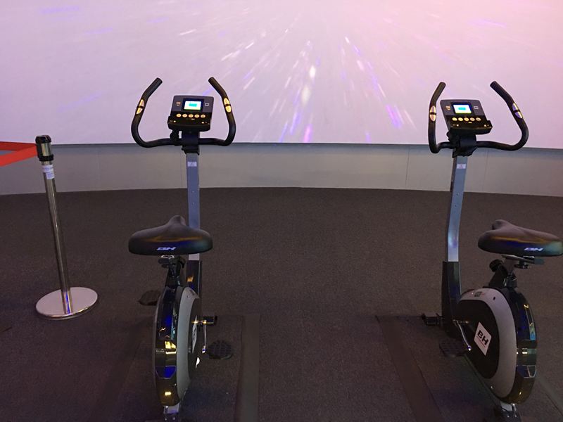 騎著腳踏車,營幕上的AR螢幕牆畫面就會往前進,根據你騎車的速度快慢,畫面前進的速度也會不同