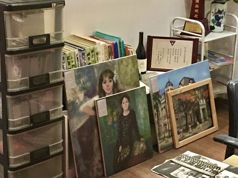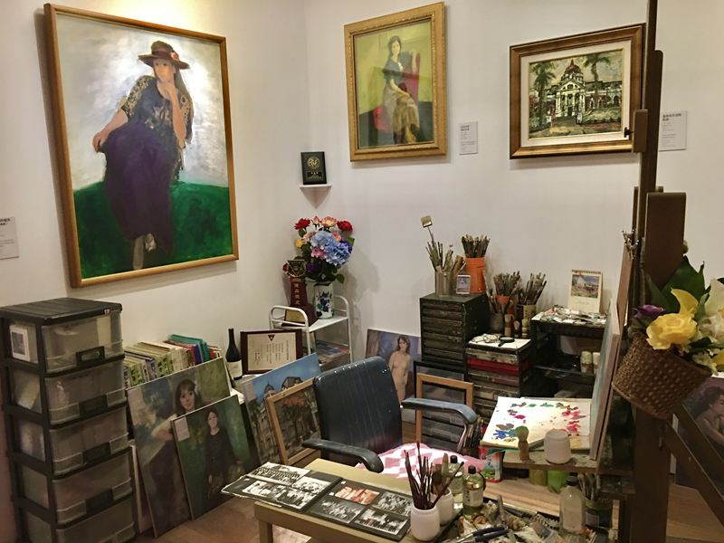 最裡面有一處空間,展示著椅子、畫架、畫具與一些完成與未完成的畫作