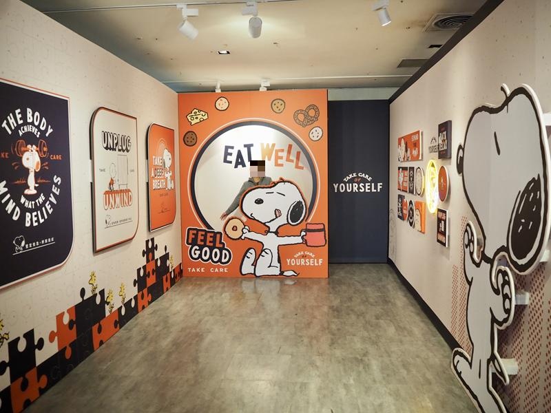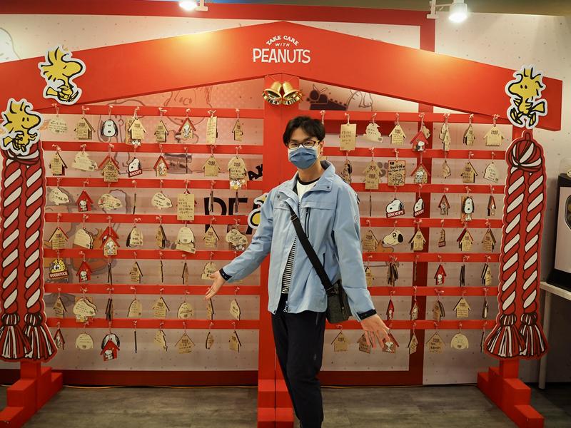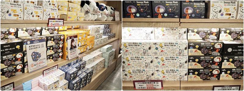 ↑ 這次展場中也是許多人都會買的聯名口罩,超多造型每種都有可愛的史努比圖案,上面還有史努比親自示範戴起來的圖案是什麼樣子 XD