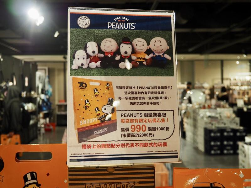 還有賣售史努比的福袋,除了有驚喜商品以外,每個福袋裡都有一隻限量版的史努比娃娃(種共有六款),造型就是下面圖片的那六隻,快來試試手氣看能不能抽到你喜愛的限量版玩偶