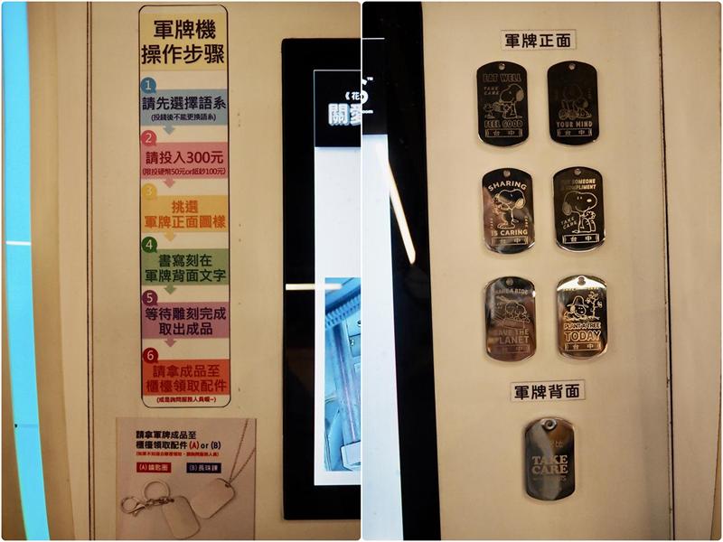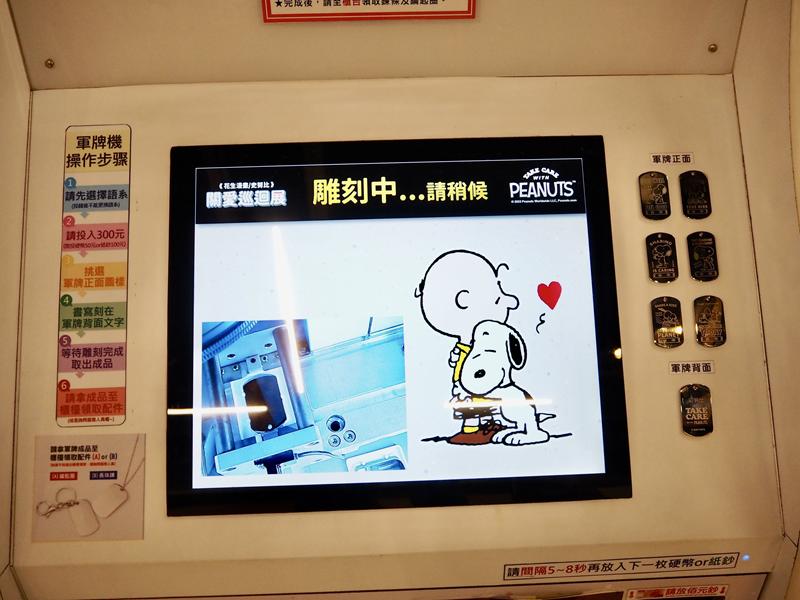 當天買了一個史努比紀念軍牌,一走過這的雕刻機就被閃亮亮的軍牌吸引,投入NT.300後選定喜歡的正面圖案,然後再輸入背面想要刻上的字,不到2分鐘就製作完成,現在已經變成流浪魚的鑰匙圈了 XD