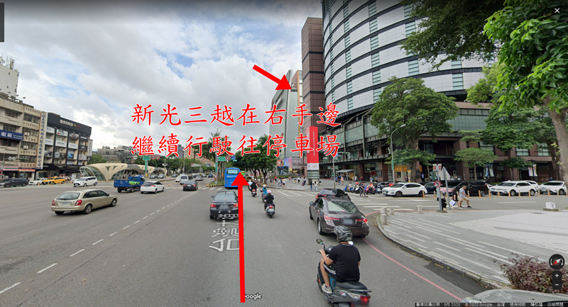 下交流道後行駛台灣大道三段外側車道,可以看到新光三越在右手邊,繼續直行前往新光三越停車場