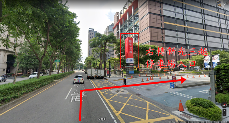接著看到新光三越招牌後右轉進入停車場