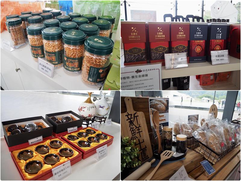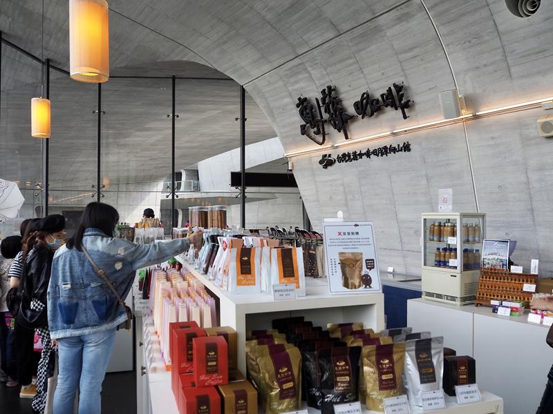 向山遊客中心內還有一間頗具特色的向山咖啡館以白色簡約風為主題,擁有一整排的落地玻璃,在這裡喝咖啡用餐還可以欣賞到日月潭的美景,除此之外也有販賣特色商品,所長茶葉蛋、魚光窯烤麵包、惠蓀咖啡等等的拌手禮