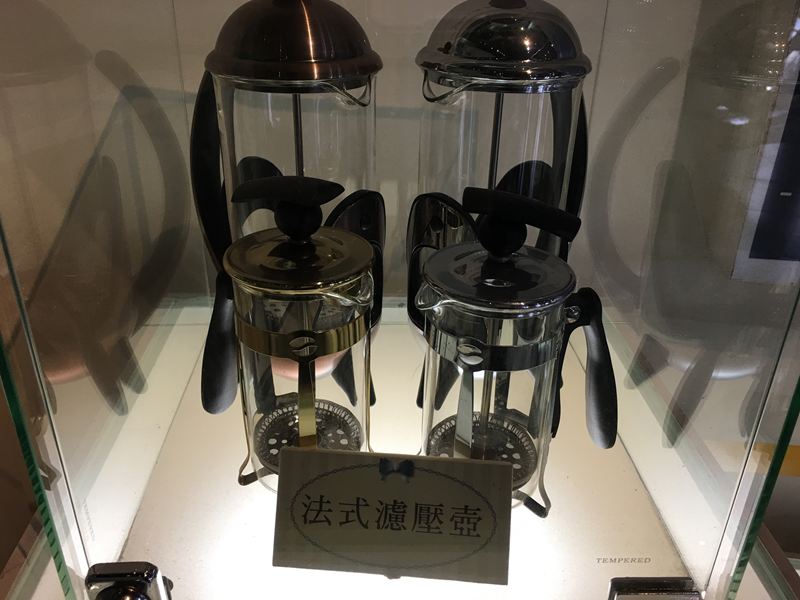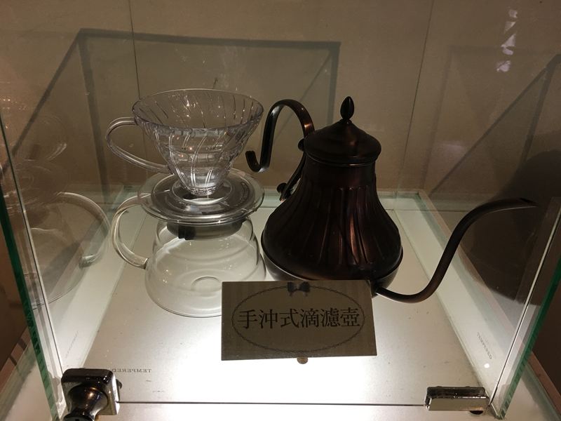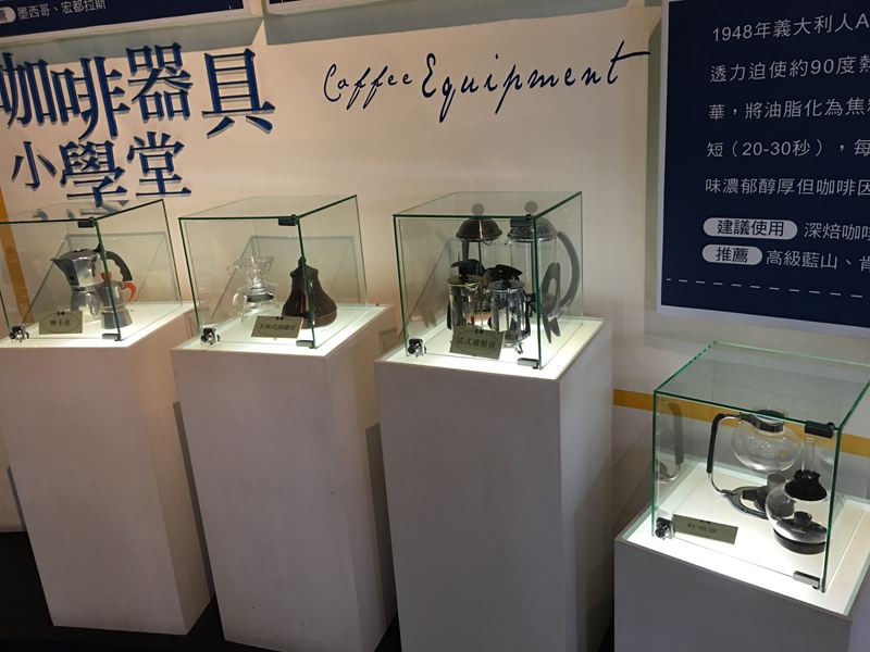 咖啡器具小學堂裡展示著,各式各樣沖泡咖啡用的器具