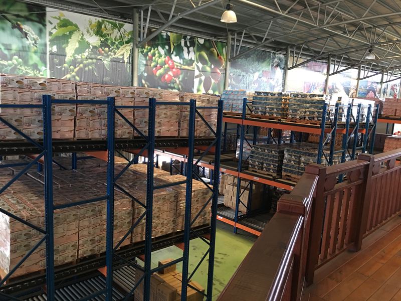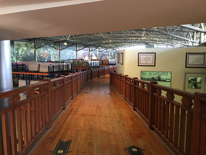 空中走廊左邊可以看到工廠內咖啡豆儲存區