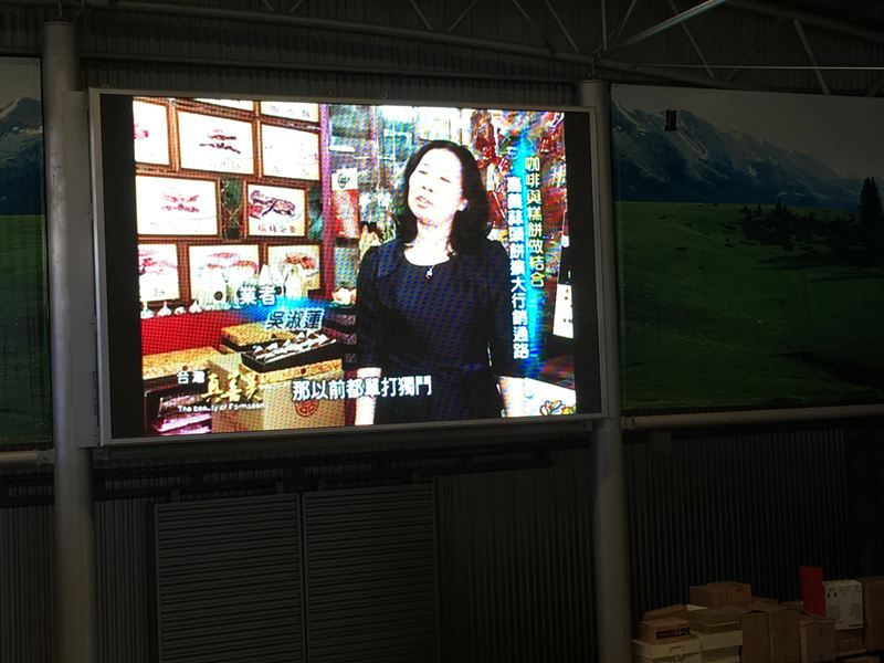 空中走廊有一個巨大的電視牆,正播放著電視台節目的採訪
