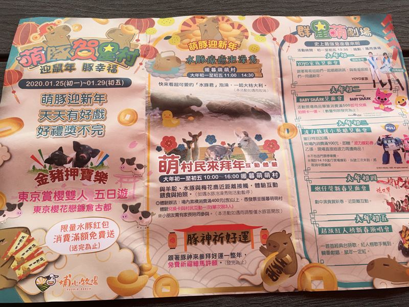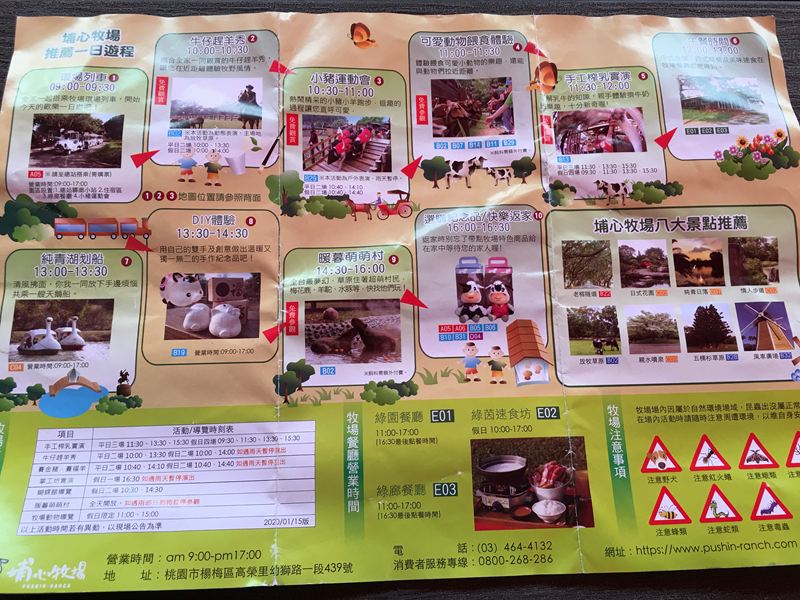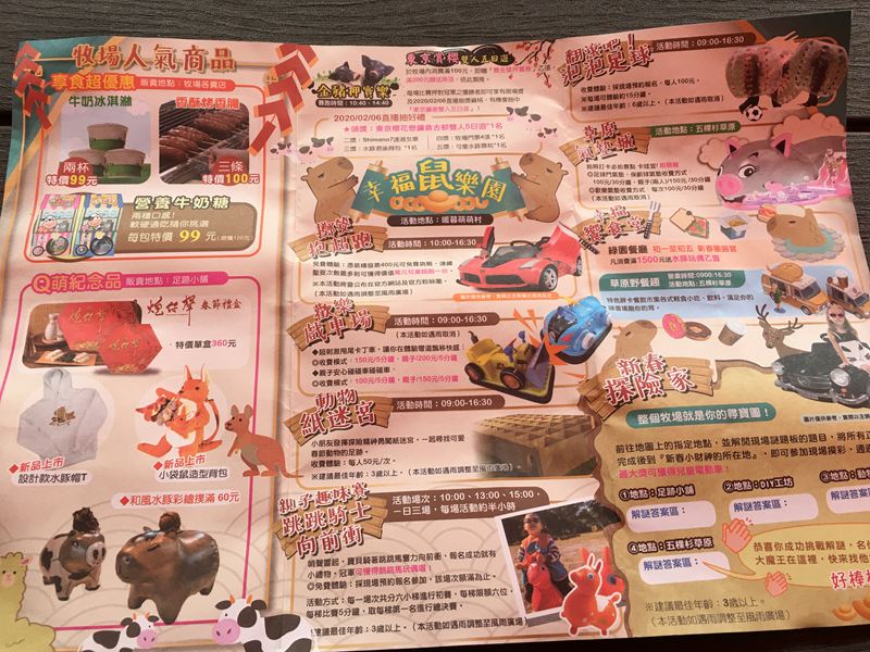 地圖背面有一整天的活動時間表,小豬賽跑、牛仔趕羊秀、可愛動物餵食體驗、暖暮萌萌村體驗等等….