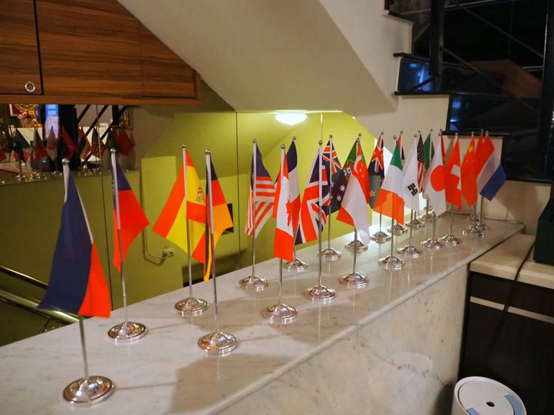 櫃檯旁擺放著多國的國旗,櫃檯服務人員看到流浪魚在拍照,就過來說這個是接待過世界各國旅客而擺放的國旗,後面還補了一句旅客待補完(好幽默) XD