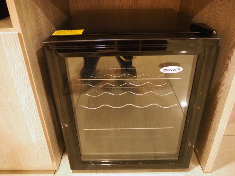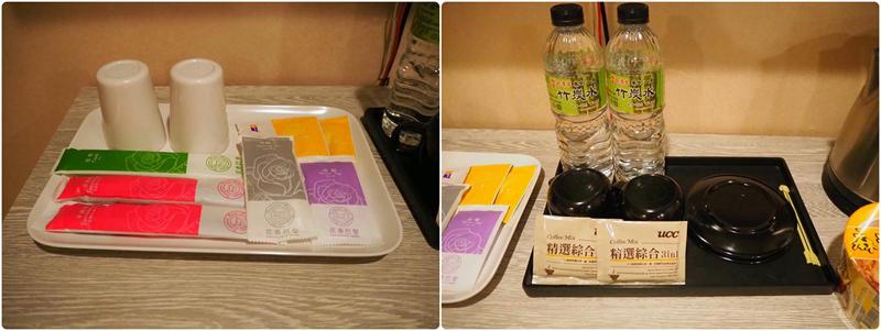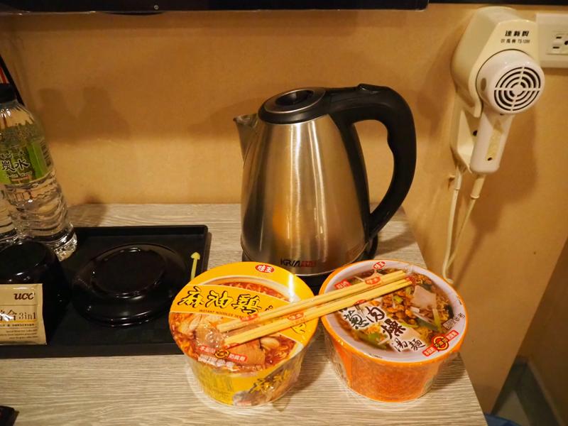 電視櫃上有簡單的MIni吧:礦泉水、咖啡包、盥洗用品都在這裡,除此之外還有附兩碗泡麵,晚上肚子餓懶的出門買東西也可以解饞一下,底下有一個冰箱但沒有附飲料