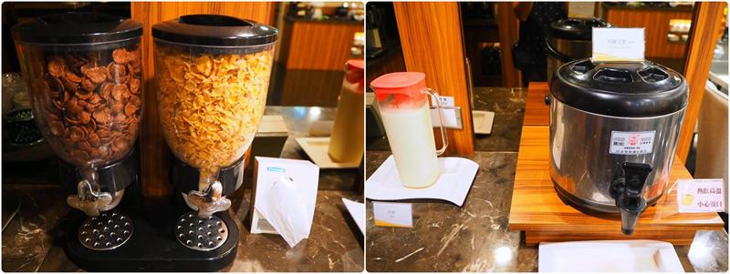早餐飲品多了這一區,有熱咖啡以及冰牛奶、黑糖豆漿、跟麥片,除了跟迎賓咖啡吧一樣有的星巴克咖啡豆,早餐多了義式炭焙咖啡豆