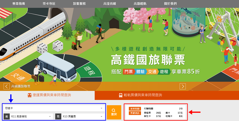 進入網站後藍框處點選使用卡別、起站、迄站按下查詢後就可以看到紅框處的票價資訊