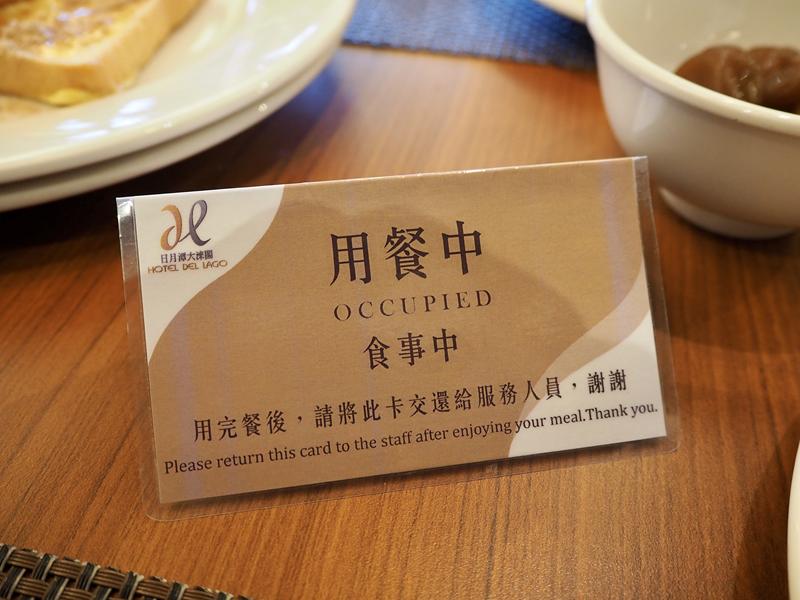隔天起了一大早,來到大淶閣飯店的杉餐廳吃早餐,在入口處把早餐卷交給服務人員,會取得一張用餐中的牌子,吃飽後再把他交還給櫃檯就可以離開了,疫情的關係用餐有分流