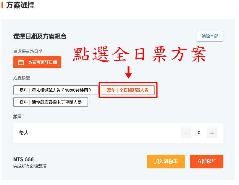 點進去購買網頁後記得點選全日暢遊單人卷即可購買一日暢遊票
