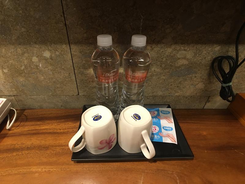 房內是42吋的電視,電視櫃上有:礦泉水、杯子