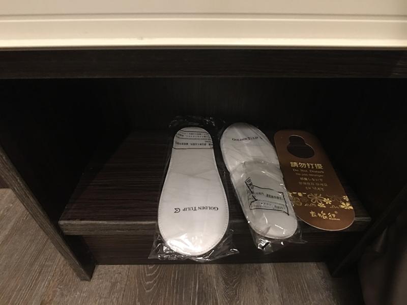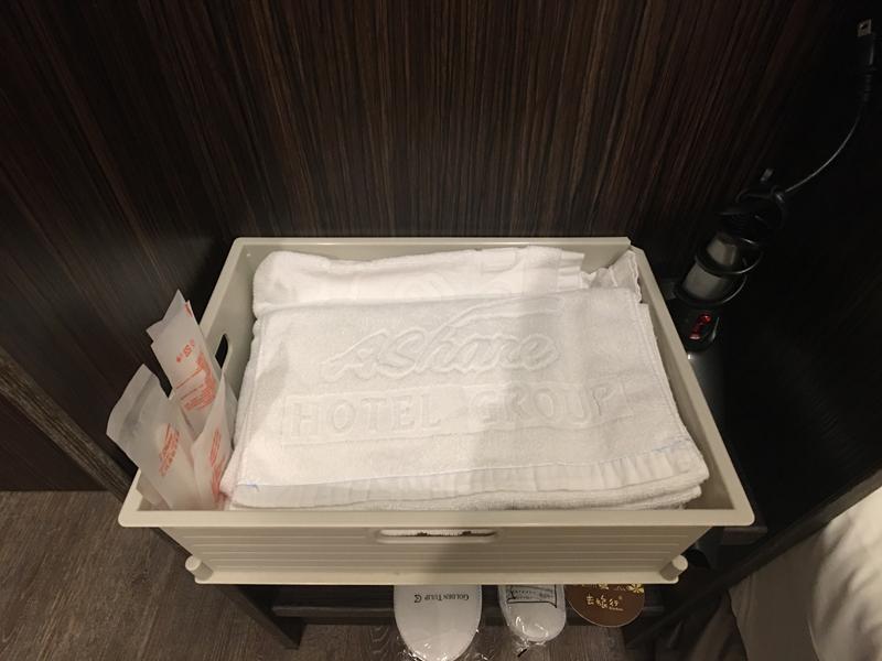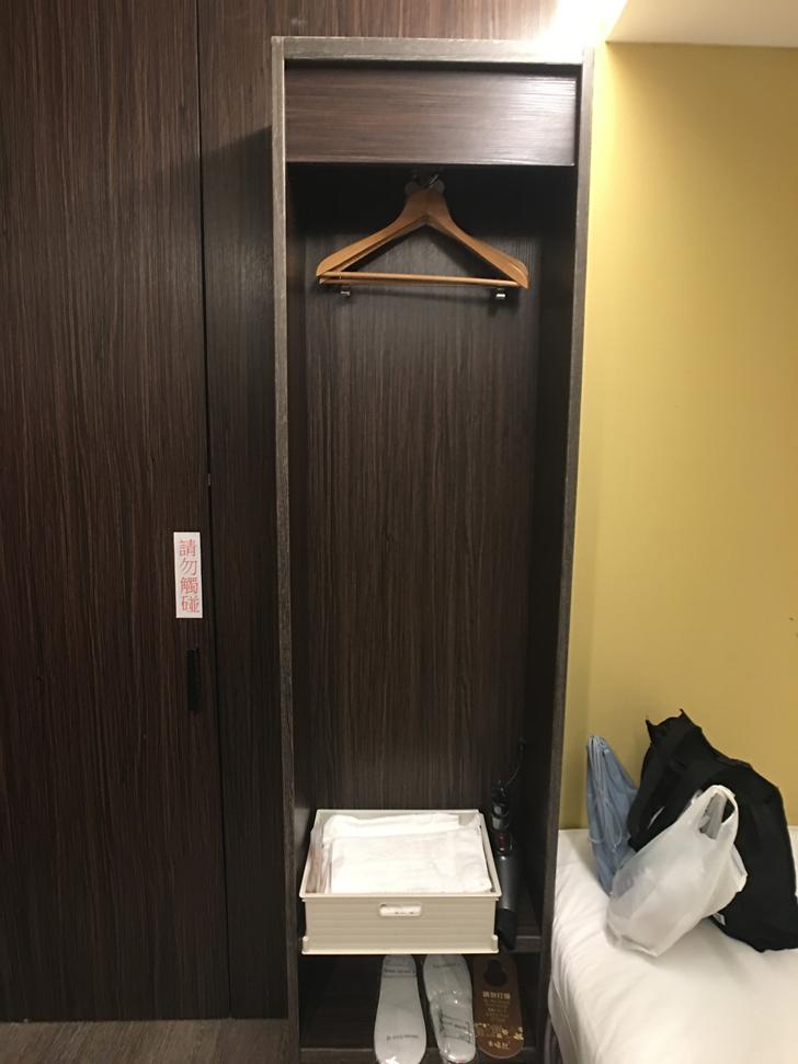 床鋪一旁有一個簡易式衣櫥,裡面有吹風機、拖鞋、毛巾、盥洗用品