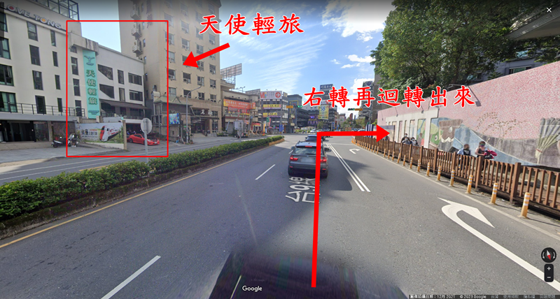 行駛至礁溪路六段可以看到天使輕旅在左手邊,這個路口不好左轉,可以先右轉進去公園路在迴轉出來會比較好行駛