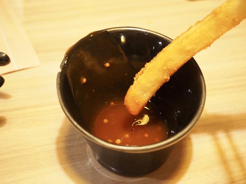 當天我們加了一個A套餐跟一個D套餐,所以有兩杯飲料+黃金脆薯+兩個甜點,薯條炸到脆脆的還不錯吃,沾上特製醬汁更加好吃