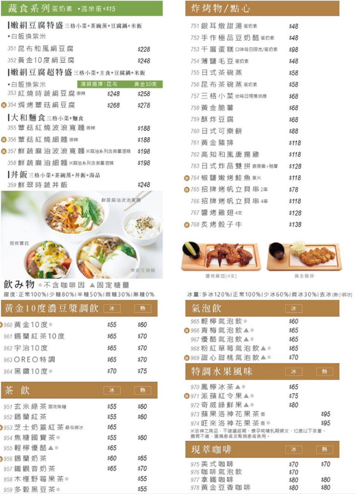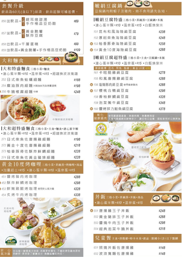 主打大和麵食、絹豆腐鍋、烤咖哩、 丼飯的主食套餐以外,還有炸物點心、飲品等等的餐點…種類相當多,主套餐系列單點沒有飲料,想喝飲料的話可以透過套餐升級(最低NT.69起),可挑NT.60以下飲料一杯(超過可補差額)+一個甜點(銀耳燉甜湯 or 手作極品豆奶酪二選一)