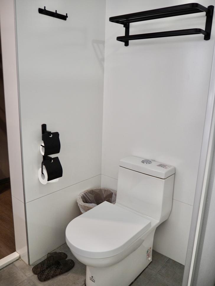 浴室空間並不大但規劃得宜使用起來還算順手,右邊是洗手檯,左邊是馬桶,裡面是淋浴間,沒有浴缸,黑白色系簡約風格乾淨明亮