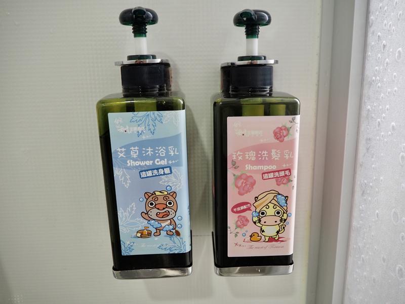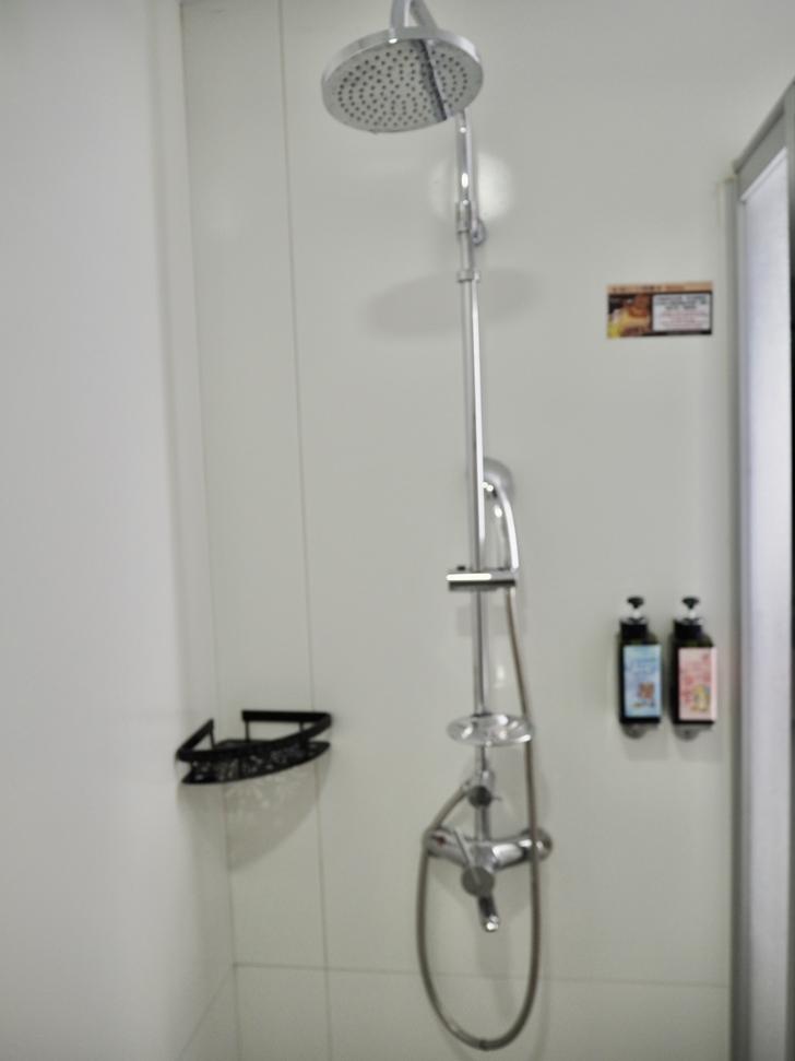 淋浴間裡簡單的蓮蓬頭與花灑,一旁的艾草沐浴乳與玫瑰洗髮精是整罐的,讓你一天多洗幾次也不用怕 XD