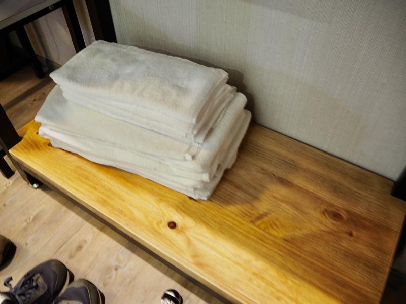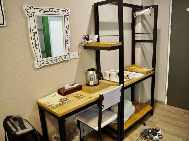 打開門後先來看玄關區的木台桌有放置:盥洗備品、馬克杯、茶包、與毛巾、浴巾、吹風機等等的用品,這個木台桌也是房間內的化妝台