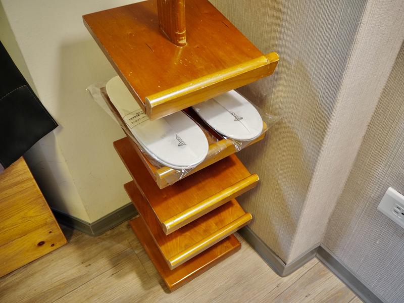 室內拖放置在靠近窗戶的木飾上,輕便形的紙拖鞋上面有著枯麻圖案