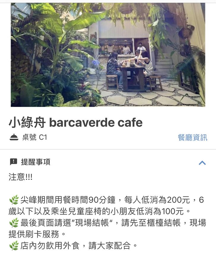 小綠舟沒有訂位預約服務,尖峰時間用餐時間90分鐘,有最低消費,早餐與午餐供應時間不同,如有想吃特定餐點要注意時間
