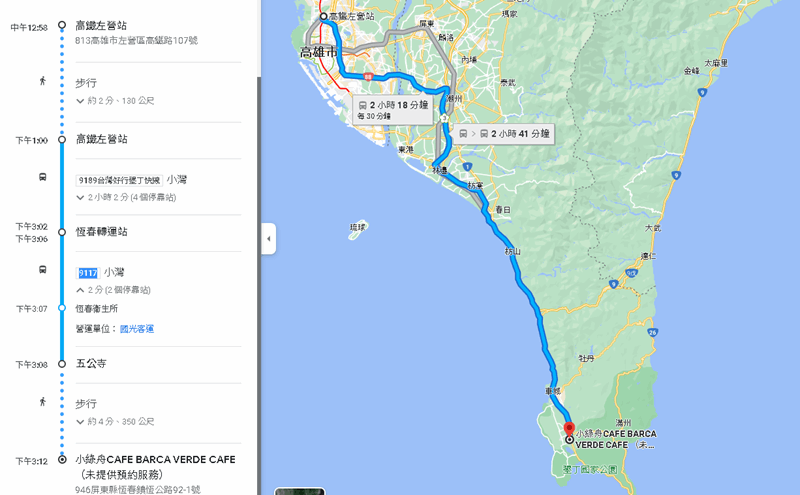 搭乘高鐵到高鐵左營站下車後轉搭 → (9189)台灣好行墾丁快線至恆春轉運站下車 → 在轉搭(9117)往小灣方向至五公寺站下車 → 在步行約分鐘4即可小綠舟咖啡