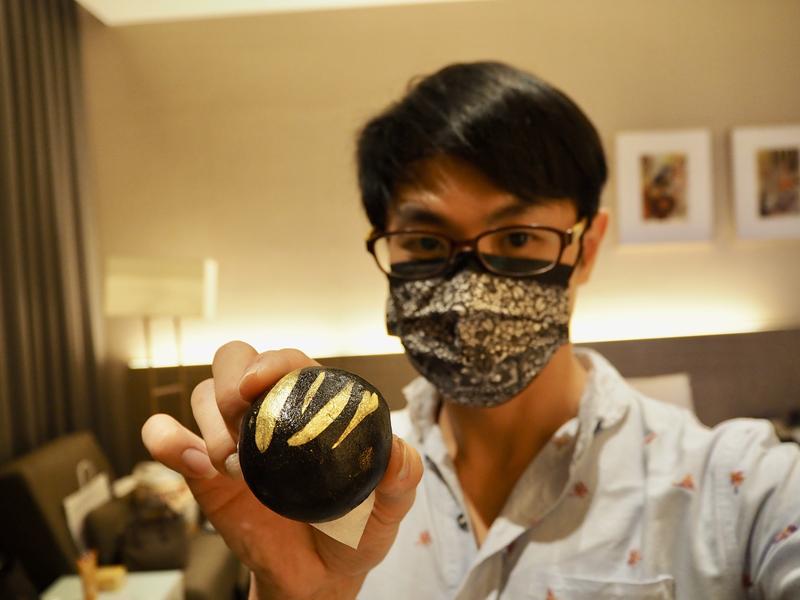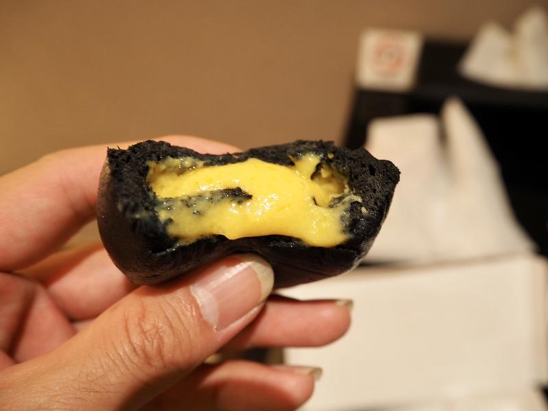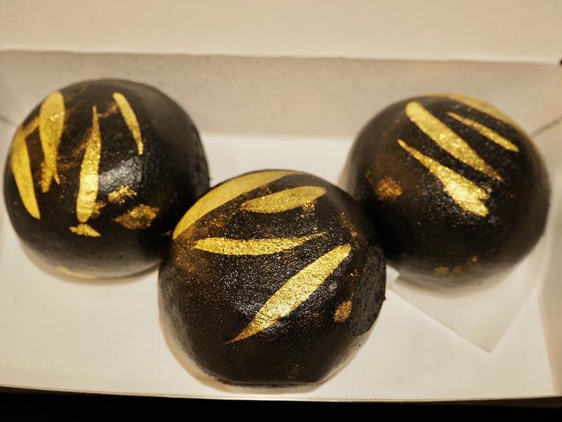 其實就是奶皇流沙包,只是把他做成比較不一樣的造型,黑的發亮的外皮,加上鉑金紋路看起來很時尚高級的感覺,滿滿爆漿的流沙內餡,還是保有流沙包好吃的特色