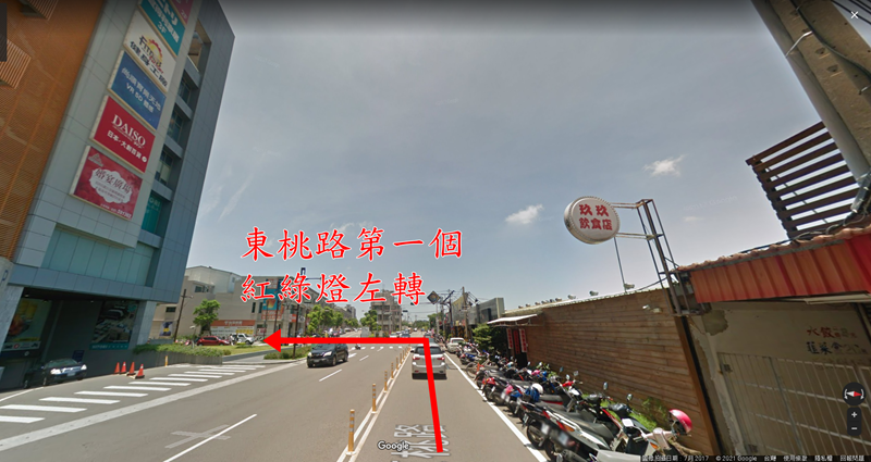 轉進東桃路後可以看到尚順購物中心在左手邊,第一個紅綠燈左轉進去可抵達飯店