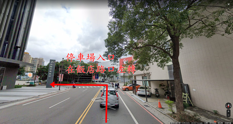 轉進來後看到飯店在左手邊,再繼續往前開到盡頭路口左轉後就可以看到飯店的停車場入口