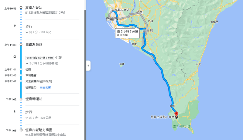 搭乘高鐵到高鐵左營站下車後轉搭 → (9189)台灣好行墾丁快線至恆春轉運站下車 → 即可抵達恆春古城商圈