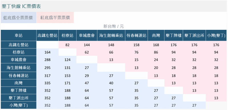 搭乘票價有分為現金價與IC票價,看完上圖還是不懂的話可以到下面的網站進去後,點選想搭的路線、起點與終點,就可以看到這趟的票價