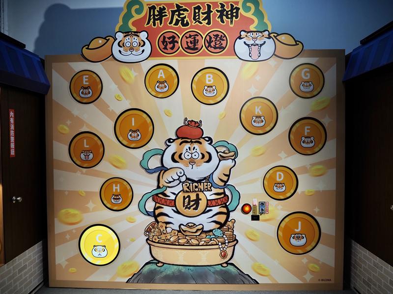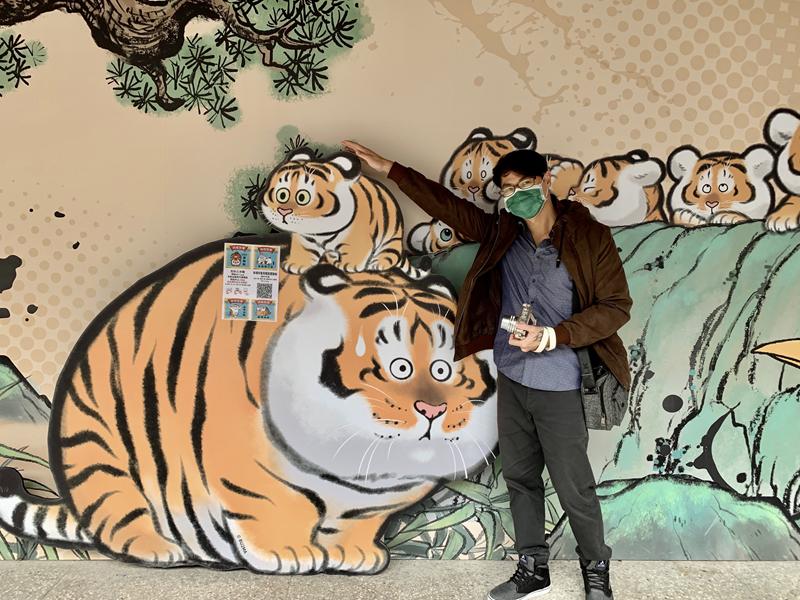 成人等身高的2.5米巨大招財胖虎充氣玩偶也超可愛,來張合照在虎年幫流浪魚招些財吧 XD