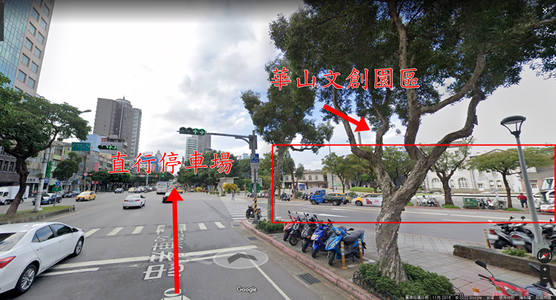 直行至忠孝東路二段與八德路一段交叉路口可以看到華山文創園區在右手邊,繼續往前行駛前往停車場